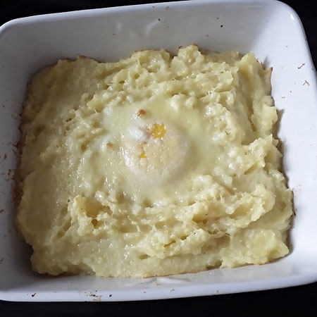2:在土豆泥中间挖一个洞,不要挖通,打入一个鸡蛋。