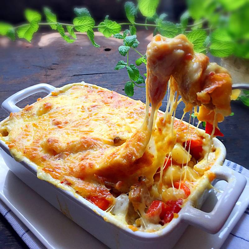 12:入烤箱中层,190度至奶酷溶化,表面烤黄出炉即可。