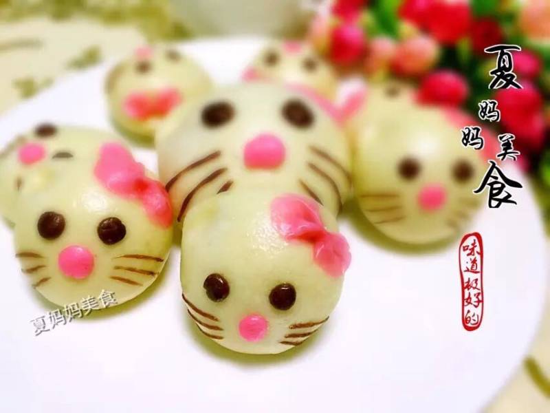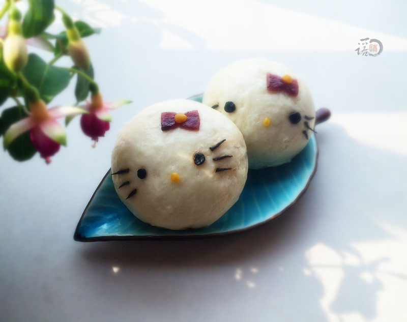 1、分别用南瓜泥、黑加仑果酱、可可粉和成的小面团,实际用量很少,我这个都多了。2、彩色面团不用发面的,可以保持蒸好的Kitty不变形3、没有黑加仑果酱也可以换成草莓酱,或者红曲粉等,只要能做出蝴蝶结的颜色就可以4、喜欢吃馅料的,也可以在里面包上奶黄馅、豆沙馅等等