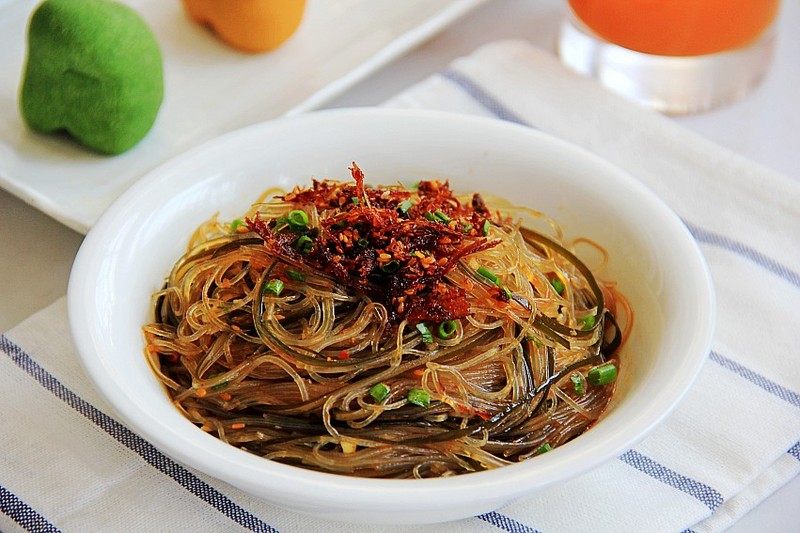 绿豆粉丝200克;海带100克;香辣牛肉丝80克;