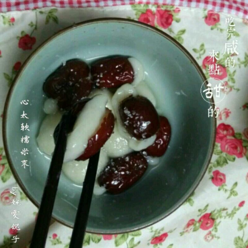 6:锅中放入适量清水,放入枣子,加入白糖和红糖,煮10-15分钟即可。枣子的香夹着糯米的软糯,好香甜的一道甜品噢