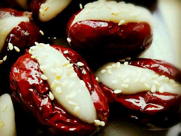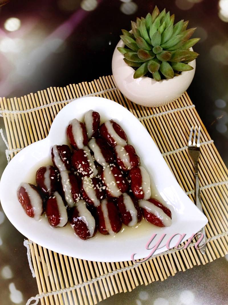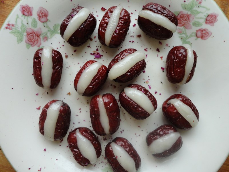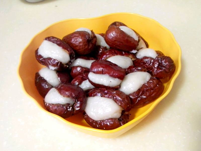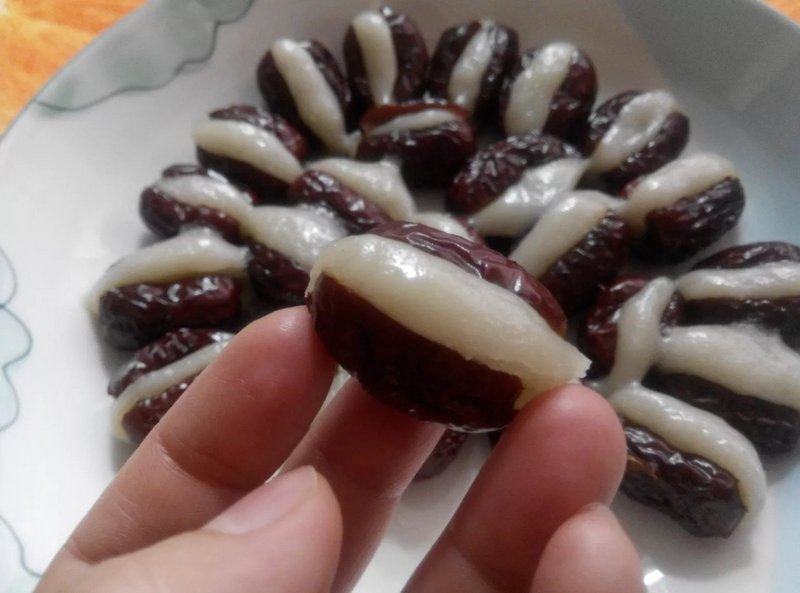 4:将糯米团搓成椭圆形的小团,夹在红枣里。