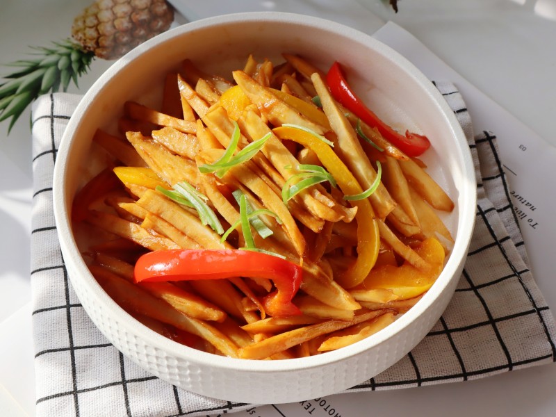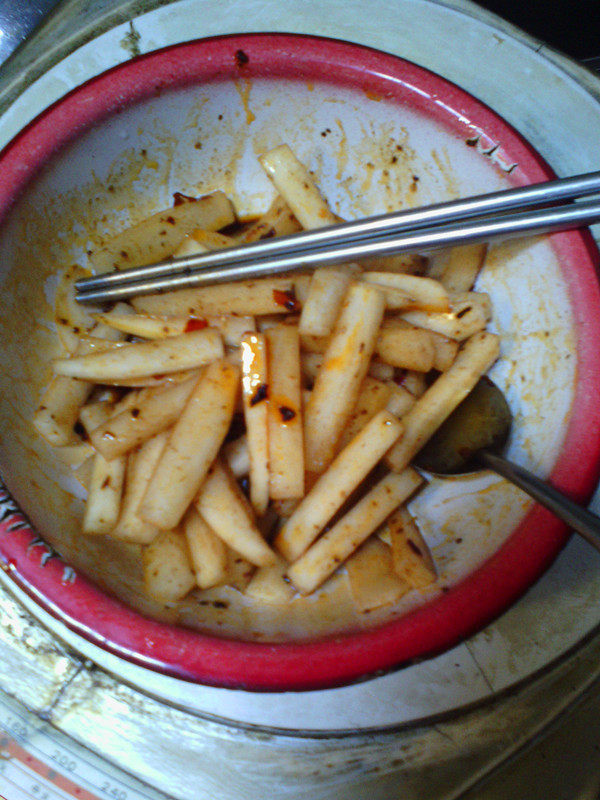 8:将炒好的酱料浇在萝卜条并搅拌均匀即可