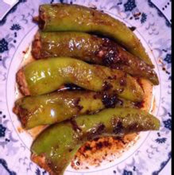 6:油锅烧热,放入填好的辣椒,撒少放食盐,盖锅焖一下。