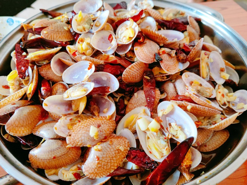 4:锅内倒油,油热把准备好的火锅料,干辣椒,蒜粒煸香,倒入花蛤翻炒后下入适量料酒,加入少许辣椒粉(爱吃辣的可放点)、盐、生抽翻炒均匀,倒入适量水,焖煮片刻,入味。