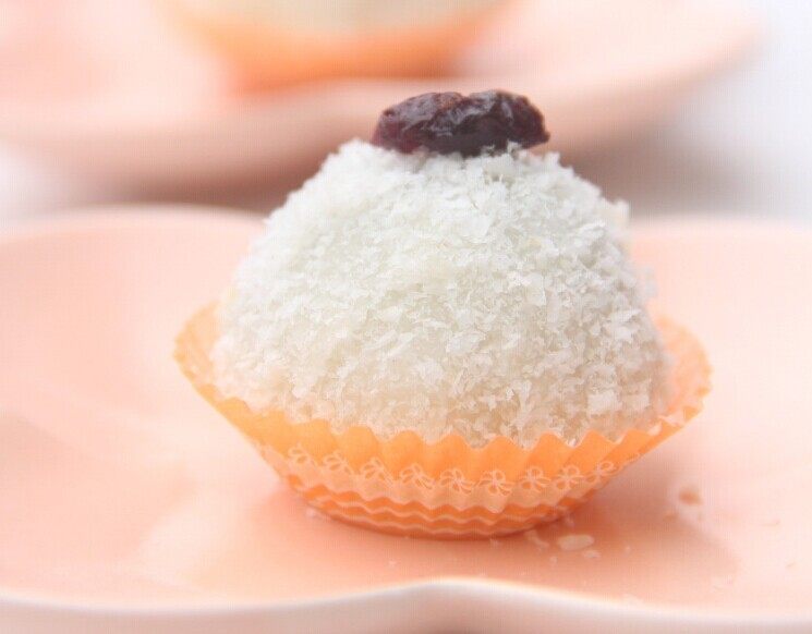 9:裹好椰蓉,装进小纸杯,糯米糍顶端放一小粒蔓越莓干装饰即可