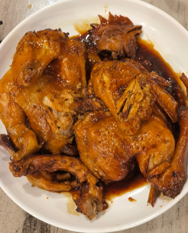 4:电饭锅选择蒸煮键。没试过煮饭键,怕糊锅。一个小时后,鸡很入味并且筷子一捣嫩滑肉就出来了。很离骨。