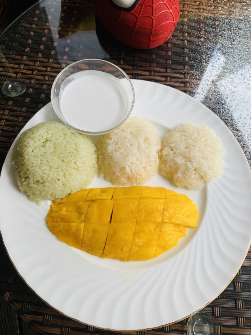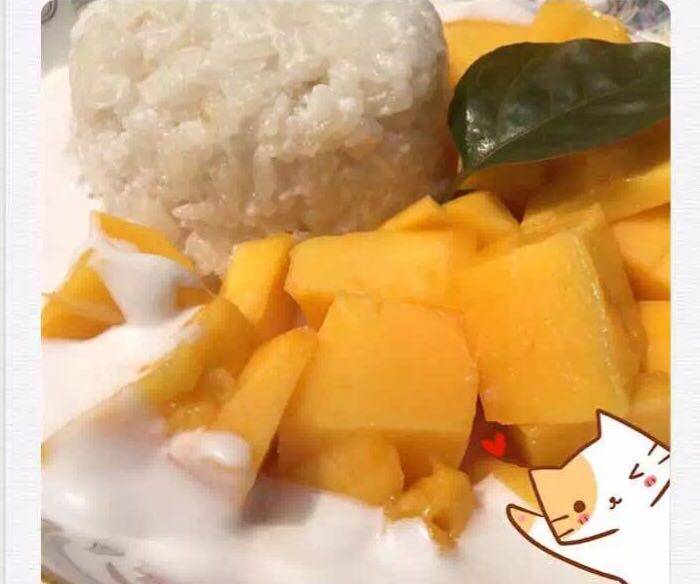 3:浇上加了糖的椰酱,摆上芒果,一口芒果一口饭,试试