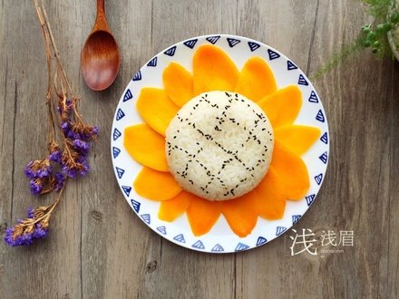6:芒果去皮切薄片,放入盘中摆成玫瑰花状,将糯米饭整形好倒入盘中。