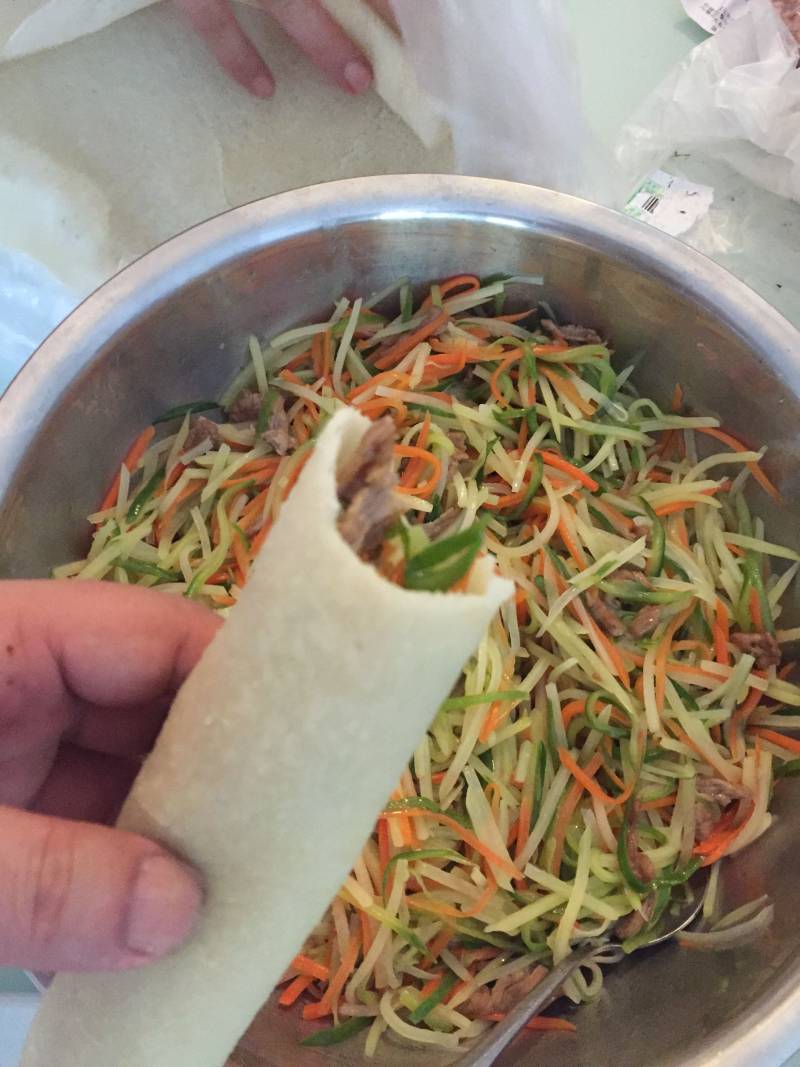 2:春卷皮薄而有韧性,一张一张揭开,里面包了两种馅,自己做的甜的红豆沙馅;以前包饺子剩下的咸的牛肉馅。包好,封口的地方抹凉水,粘一下。