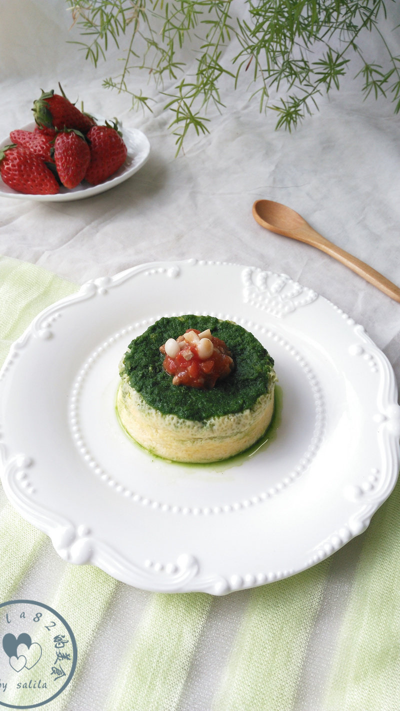 12:鸡蛋椰奶液蒸好后倒扣,放一层荠菜泥,再放少许番茄肉酱。