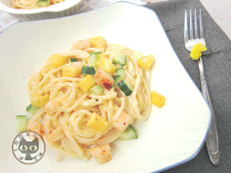 意面100克;菠萝1/4个;鸡蛋黄1颗;小黄瓜适量;萝卜泡菜适量;