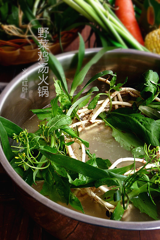 4:把野菜材料放鸡汤内煮15分钟左右,即可作为火锅汤底,配搭上个人喜欢的肉类、鱼类等等材料就可涮火锅了