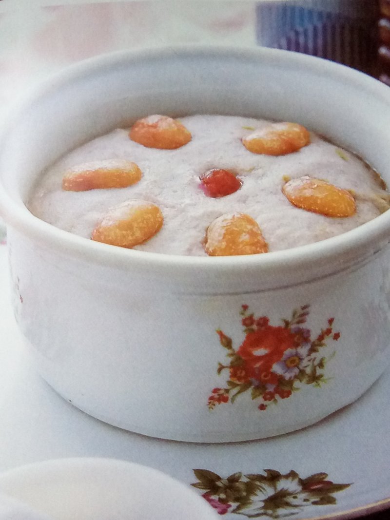 3:将做法一食材道路陶磁骨,排入蜜花豆,红樱桃,盖上保鲜膜,放入蒸笼中,用大火蒸约20~25分钟完成。