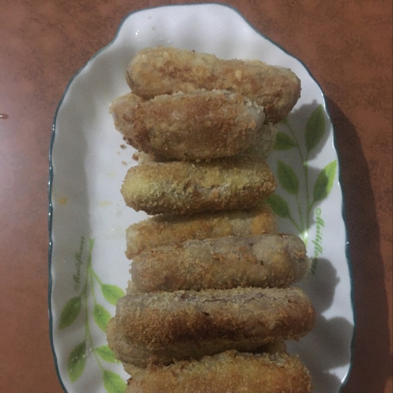 5:准备面粉,蛋液,面包糠,三样一次滚一圈,只要把芋泥条放到碗中把碗摇一摇就均匀裹好了。(面粉可以不要,只要蛋液和面包糠)