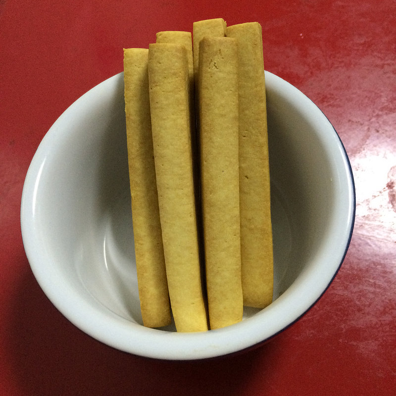 5:切约0.5CM宽的长条,放入入烤盘。烤箱预热170度,中层,上下火,25-30分钟,烤硬放凉即可