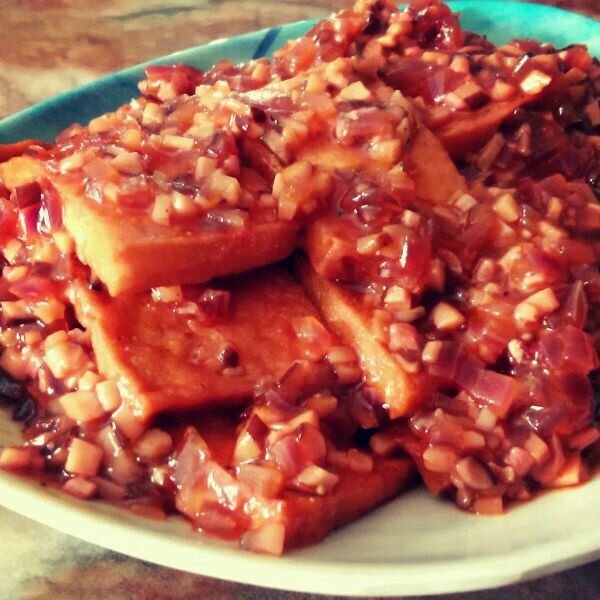 5:刚刚煎豆腐的锅,把剩下的油倒出来。用锅底沾的油就可以了。一勺番茄酱,一勺蚝油,入锅小火翻炒至融合均匀。