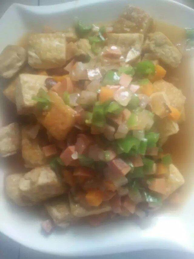 1:洋葱,胡萝卜,青椒,火腿肠,香菇切丁