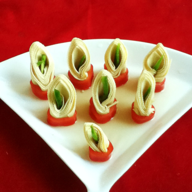 1:将豆腐皮洗净卷起成柱形,用刀斜切断成等份。红辣椒去掉籽切成相等份之小段子。