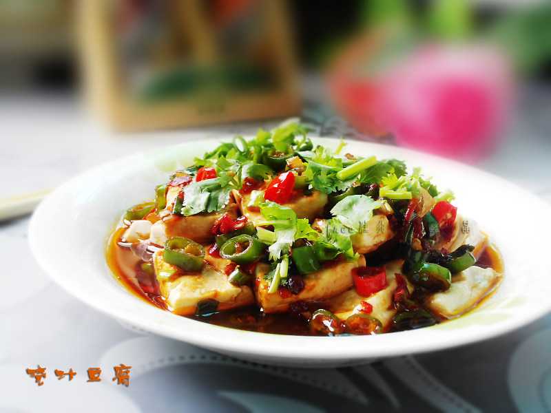 5:蒸好的豆腐倒掉蒸出的水份,用小刀划几刀,倒入调好的酱汁,撒上花生碎、芝麻和香菜即可