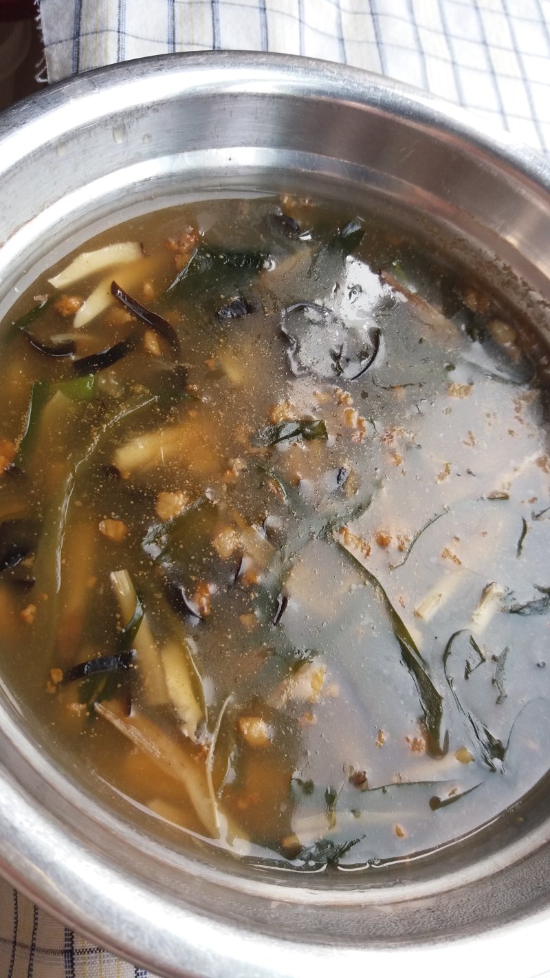 5:锅内放少许油,煸香葱姜蒜,倒入香菇丝、黄花菜、木耳丝煸炒片刻,再倒入肉沫,加入800g水,倒入海带丝。