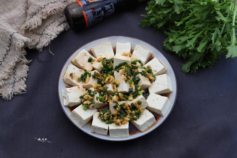 5:将焯好水的豆腐捞出来,码入盘中摆整齐,然后将调好的料汁浇在豆腐上即可,吃的时候夹一块豆腐,沾一层料汁,鲜美可口。