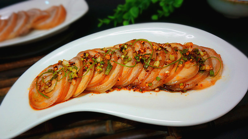 9:猪肘冷却后,去骨切片装盘。可以放冰箱冰几小时再拿出来切,冰一下可以让肉质收缩,切好后吃起来更有嚼劲。