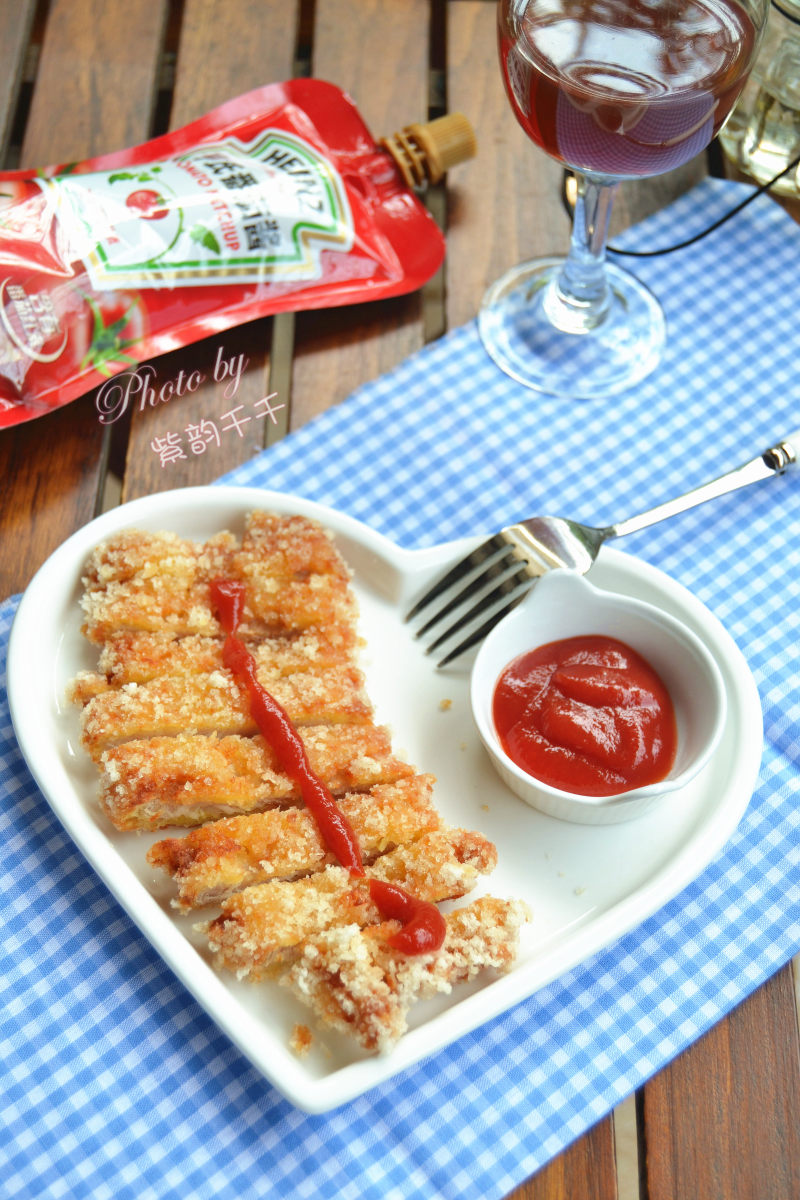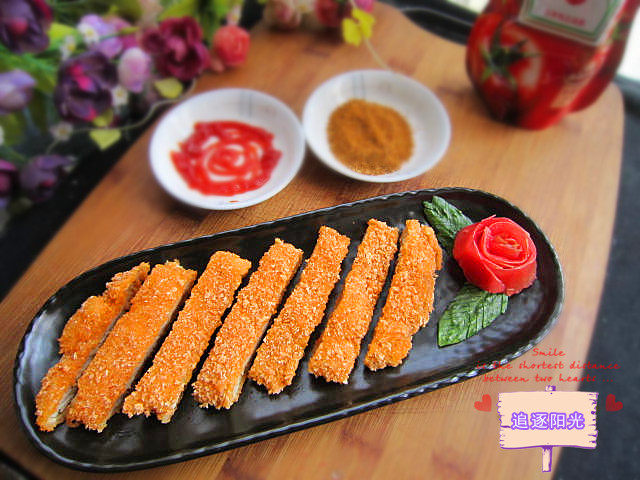 一共沾三次鸡蛋液,两次面粉,最后一次沾完鸡蛋液后就沾上面包糠。上桌时配上酸辣汁或者番茄酱作为蘸料。