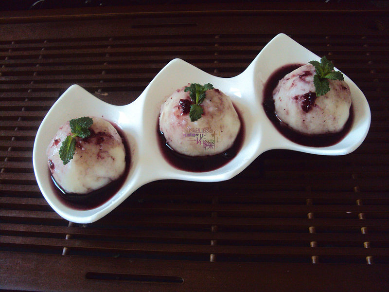 3:3。做好造型入盘,淋上蓝莓酱即可