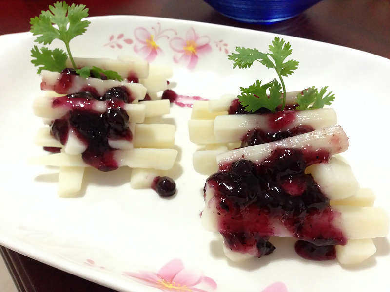 5:蓝莓酱加入等量的凉白开水稀释,滴入山药上,酸甜可口的蓝莓上药来喽……