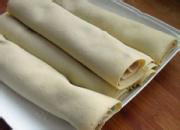 9:把面饼从一头像另一头卷起来,稍微压实整理一下。