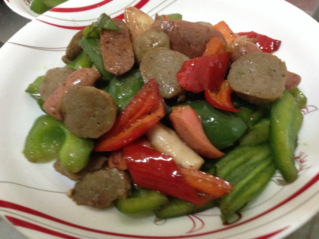 火锅丸子500克;青椒1个;圆椒1个;红椒1个;