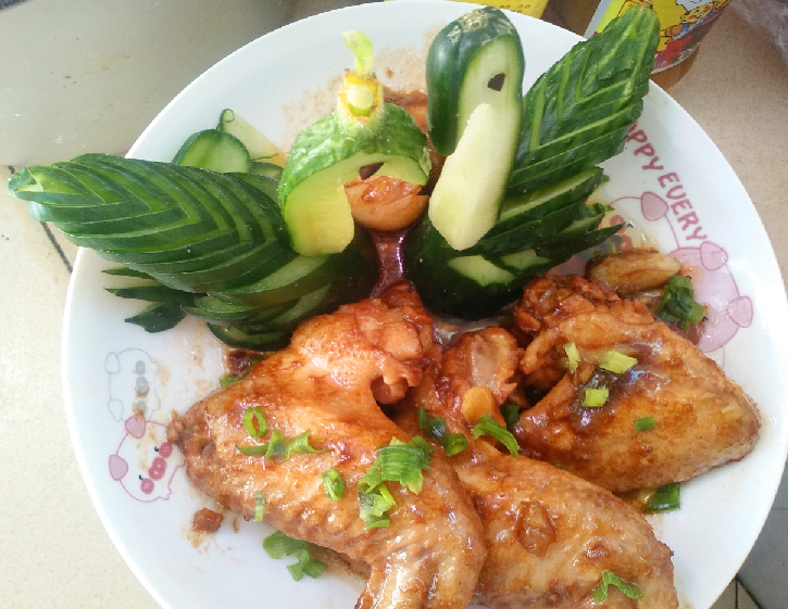 5:把腌制鸡翅的酱汁加一勺子清水,倒回锅中火加盖焖10分钟,最后加一点点生抽,翻炒均匀装盘,撒点葱花或白芝麻。