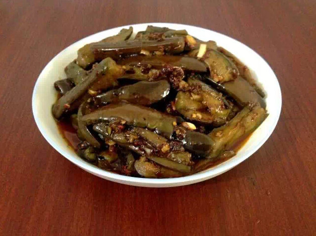 5:将过油后的茄子放入锅中,稍加一点点水,略翻炒几下,即可起锅装盘了。