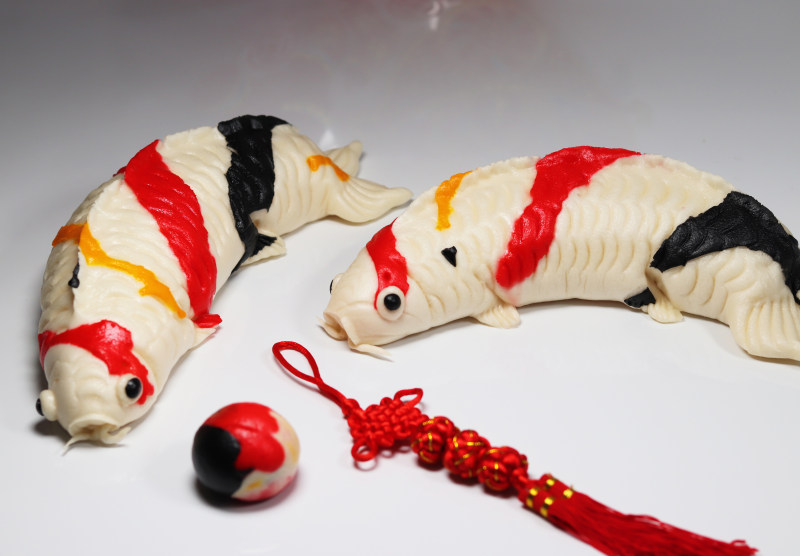 12:用勺子的小头在鱼身上戳出鱼鳞,取一块白色小面团、叠上黑色小面团做出鱼眼睛,再用白色面团搓成胡须安在嘴里。