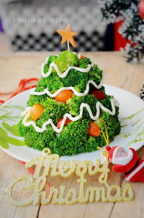 Ps:1、焯水时锅中滴入油和盐能够使西兰花翠绿。2、将土豆泥整形为圣诞树的过程需要几分钟的时间,要耐心点。如果有模子就简单了。3、除了胡萝卜,还可以用切开的小番茄、红黄彩椒或者玉米粒装扮。嗯,给自己的生日礼物——圣诞树沙拉。O(∩_∩)O