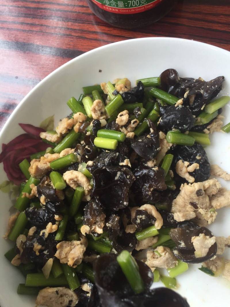 3:红油,倒入花椒,辣椒变黑后放葱姜蒜,倒入肉炒至变成白色,放糖,醋,生抽,倒入蒜台,炒一会倒入木耳。