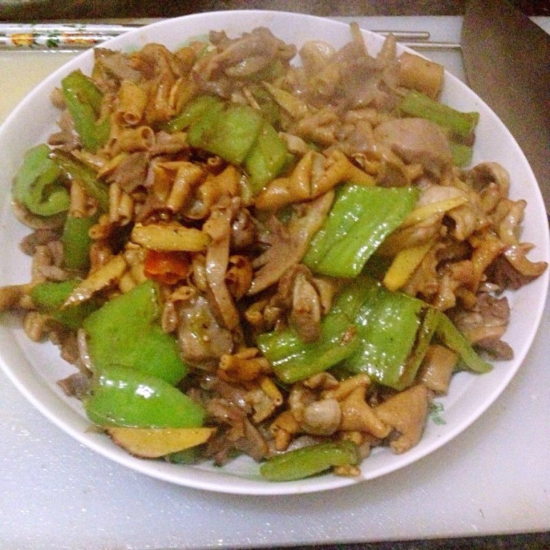 8:这里鸭肠可以起锅,留点儿油,炒青椒。然后鸭肠再一起下去翻炒!这样个人觉得比较好吃!也可以青椒直接下锅!