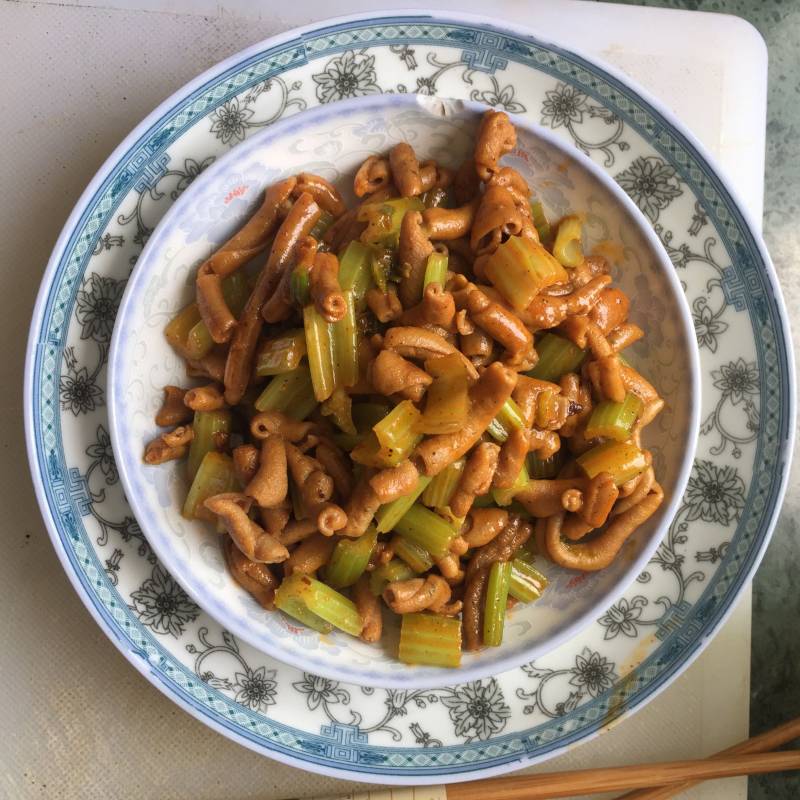 5:讲红油倒入锅中烧热,放入芹菜翻炒,再放入切成段的鸭肠翻炒,加入少许糖,半勺盐调味