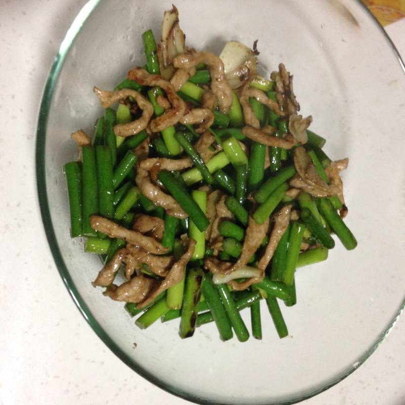 7:把之前炒好的瘦肉倒入蒜苔里,一起翻炒2~3分钟后,起锅。