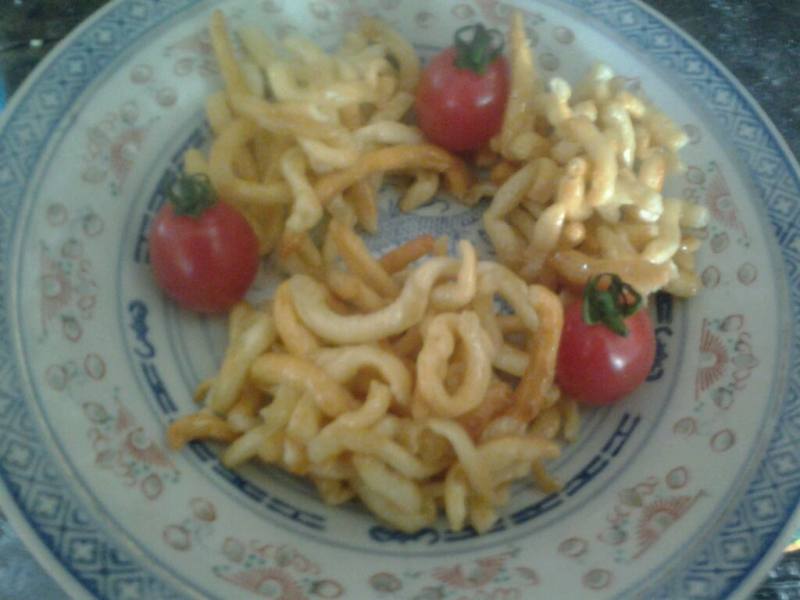 6:锅中放油,小火,放入面条,分批炸,只要面条变色就可以捞出;