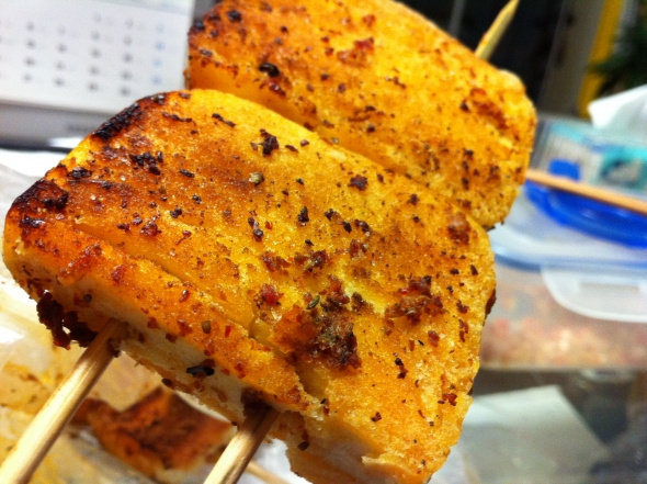 4:取出,将馒头片翻面,再刷调料,继续烤8分钟左右,馒头微焦即可