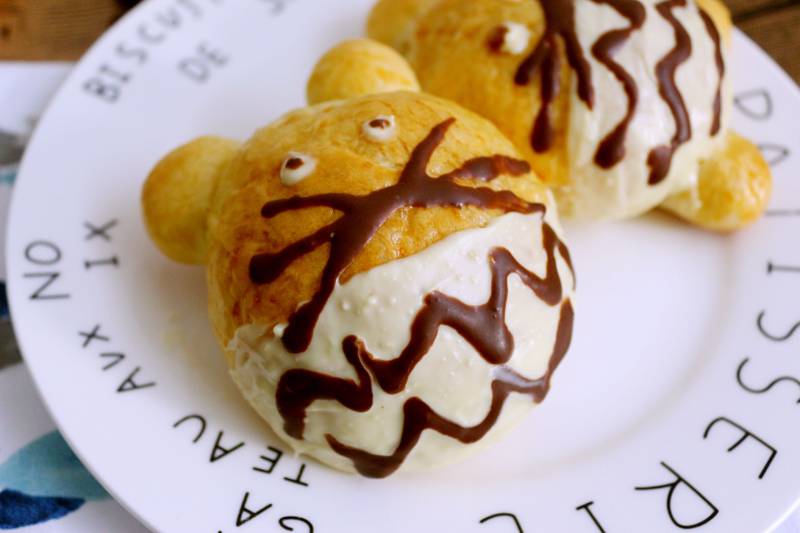 9:面包烤好出炉后,稍微晾凉下,这时准备把白巧克力,隔50度的水溶化,溶化好的白巧克力,在龙猫的肚子上涂上白巧克力,均匀涂抹就好,再在上方画上两点,做为眼睛