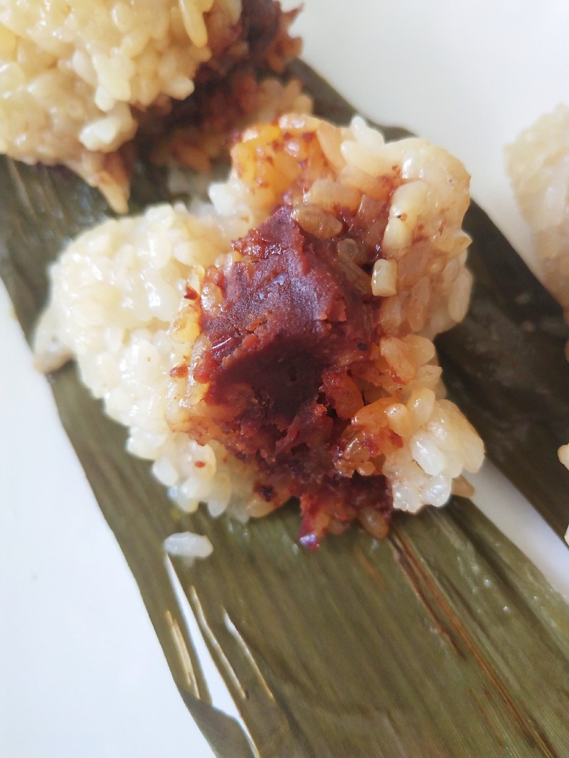 13:洗好粽子叶,加入揉好的糯米,分好玫瑰豆沙,大约25克。