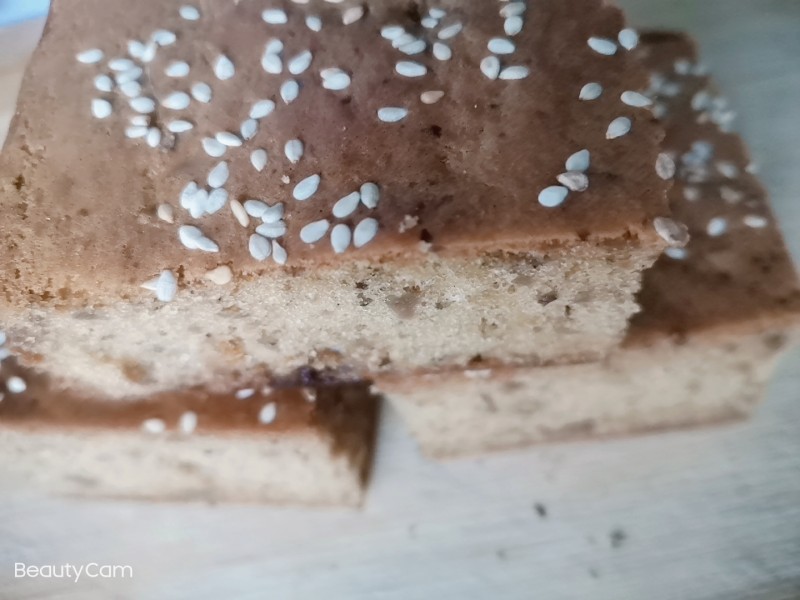 8:烤箱预热150度。模具放入油纸,倒入面糊。把模具端起来稍微震动两下,消掉大的气泡,撒上芝麻,放进烤箱。
