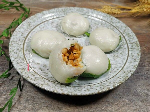 7:糯米团分成小份,捏窝窝状,包入笋干肉末馅,收口。