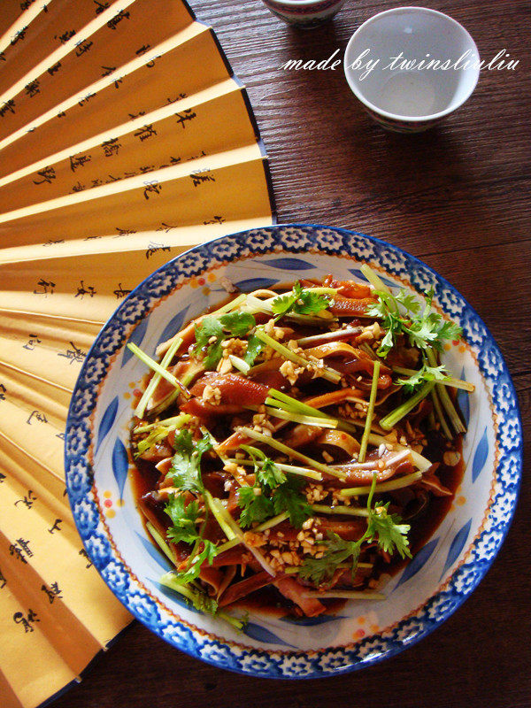 10:根据食用人数取适量卤制好的猪耳朵,将其切成丝,加醋、花椒油、少许盐、香油、蒜末儿、搭配香菜、葱丝或黄瓜凉拌。
