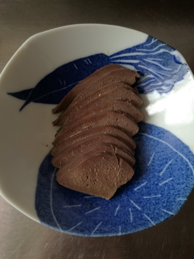 3:锅里放凉水下猪肝,水开后撇沫,放所有辅料,卤水两勺半,生抽半勺,小火煮20分钟关火,猪肝一直放锅里晾凉。