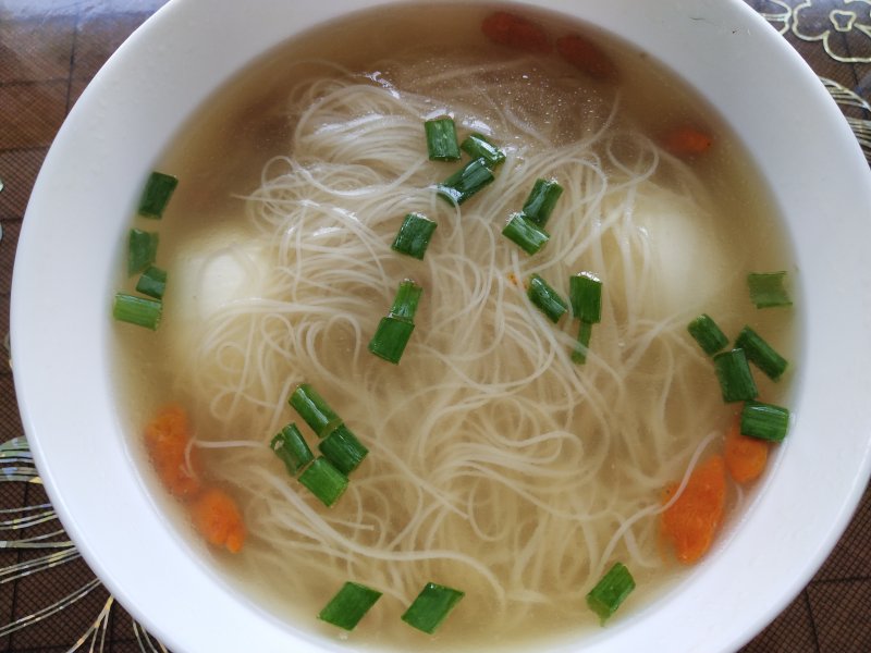 5:锅里烧点清水,水开后将线面投入沸水锅中,再沸即可捞起,盛入事先备好的鸡汤中。