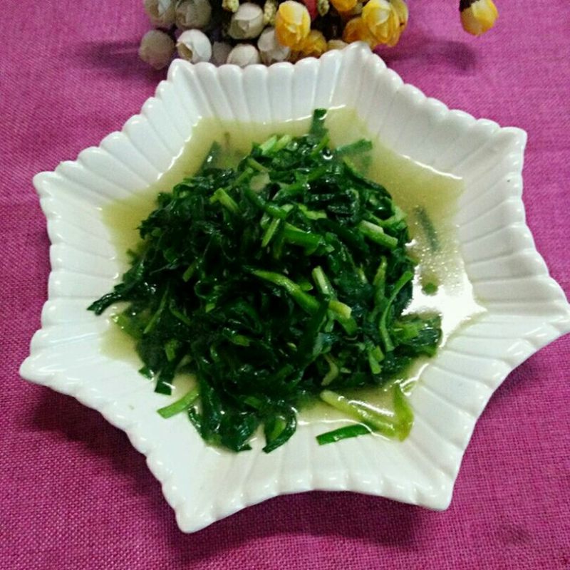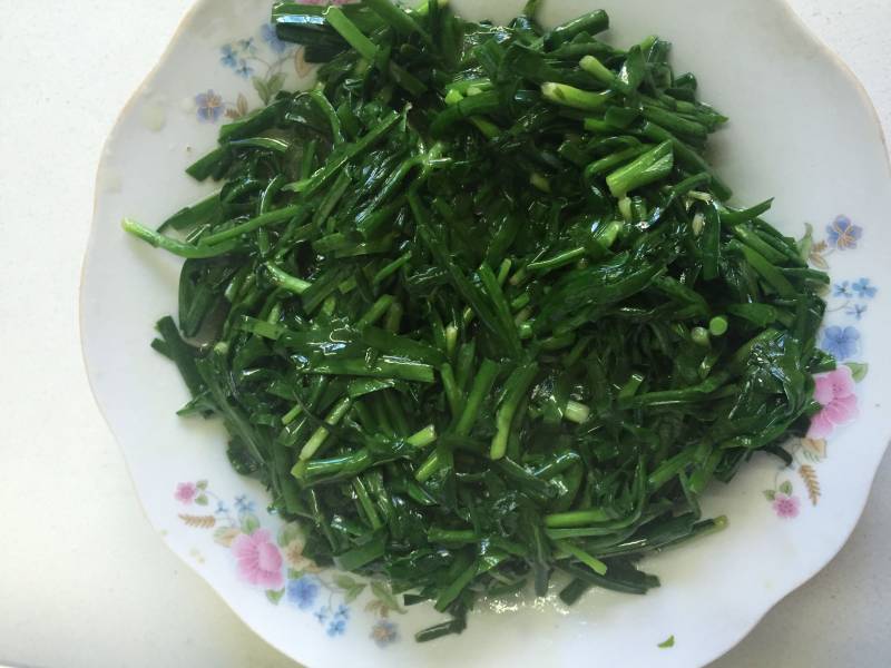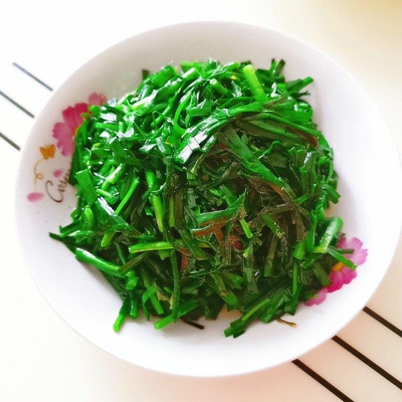 3:看,香气扑鼻的炒韭菜就好了,绿油油,好下饭啊。炒韭菜的油和盐都要比平时多一些,淡了会不好吃。韭菜要快炒出锅,时间久了炒烂了就味道会差了。